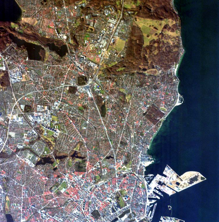 Initially launched as a technology demonstration mission, PROBA-1’s design was highly innovative and the satellite platform and CHRIS payload effectively work as one to image the Earth. Using a star tracker for guidance, the satellite can roll off to ±25º off-nadir in the cross-track direction and ±55º in its along-track. This tracking ability allows PROBA-1 to compensate for the effective satellite groundtrack speed and this ‘forward motion compensation’ boosts its overall integration time per image, giving CHRIS an imaging performance and signal-to-noise equivalent to that of an instrument with an aperture area five times larger. This agility means that CHRIS can also view the same target from five directions, a unique feature of the mission and instrument and this capacity in particular that has proved invaluable to many scientists investigating the BRDF (Bi-Reflectance Distribution Function) of vegetation and other land cover features – meaning how the light they reflect changes with shifts in illumination or view angle. The wavelength and bandwidth of each spectral band is fully programmable, and 18 spectral bands can be selected in each image. This can be increased to 62 bands per image at a lower spatial resolution.